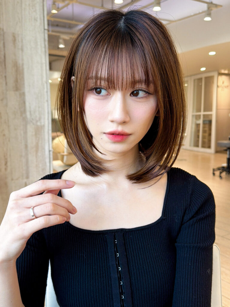 ベースは重さを残してまとまりやすくしつつ、顔まわりにのみ軽やかなレイヤーを入れています。前髪は目元ギリギリのシースルーバングにすることで、目力を強調しながら、大人っぽい抜け感を演出します。